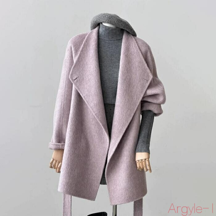 上品でリュクス感が漂う、ノーカラーのミディ丈コート。