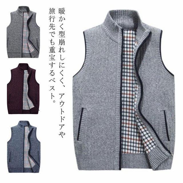 ハイネック 冬 メンズ 前開き ベスト メンズファッション 豊富 ブルー ダークグレー ライトグレー ワインレット M L XL 2XL 3XL