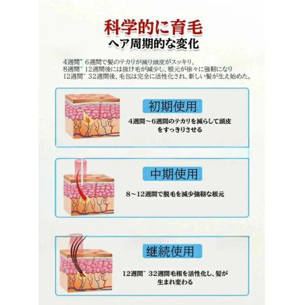 人体の質によって異なり、効果の長さも異なり、多くの顧客のフィードバックによると、最速8週間、最低32週間は明らかな効果があり、発毛液と合わせて使用すると効果がより良い。