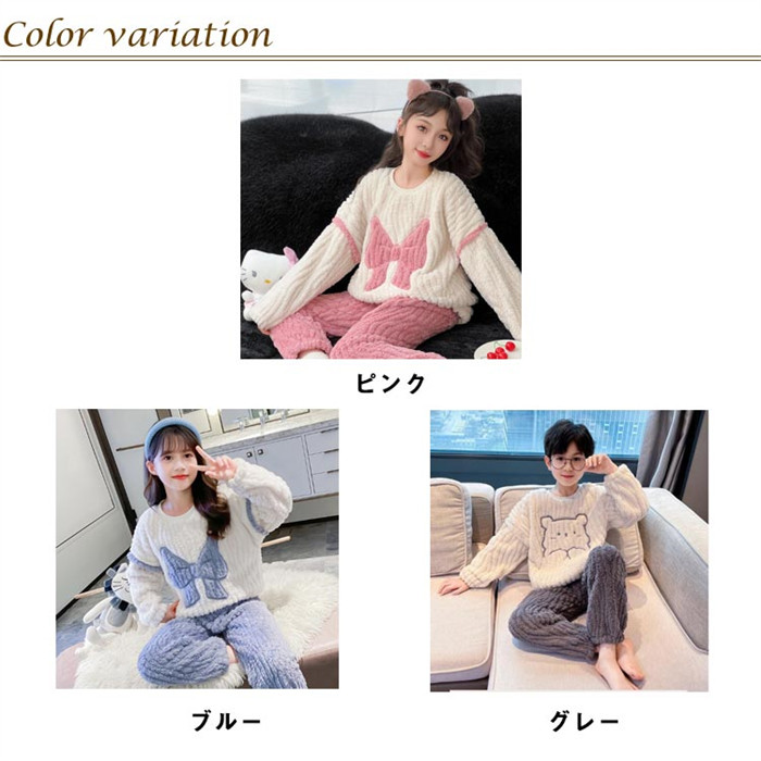 キッズ 上下セット パジャマ 女の子 男の子 長袖 冬 子供 トップス ボトムス パンツ トップス+パンツ 部屋着 もこもこ 110 120 130 140 150 160 寝巻き ウエストゴム 袖口 伸縮性 ストレッチ 厚手