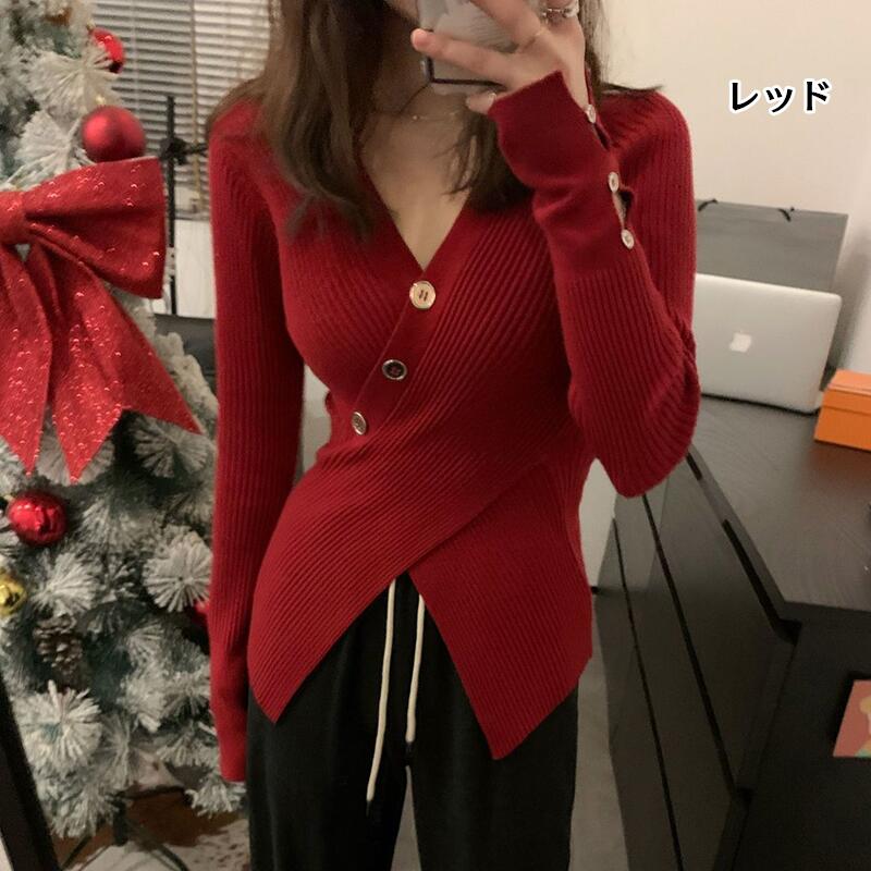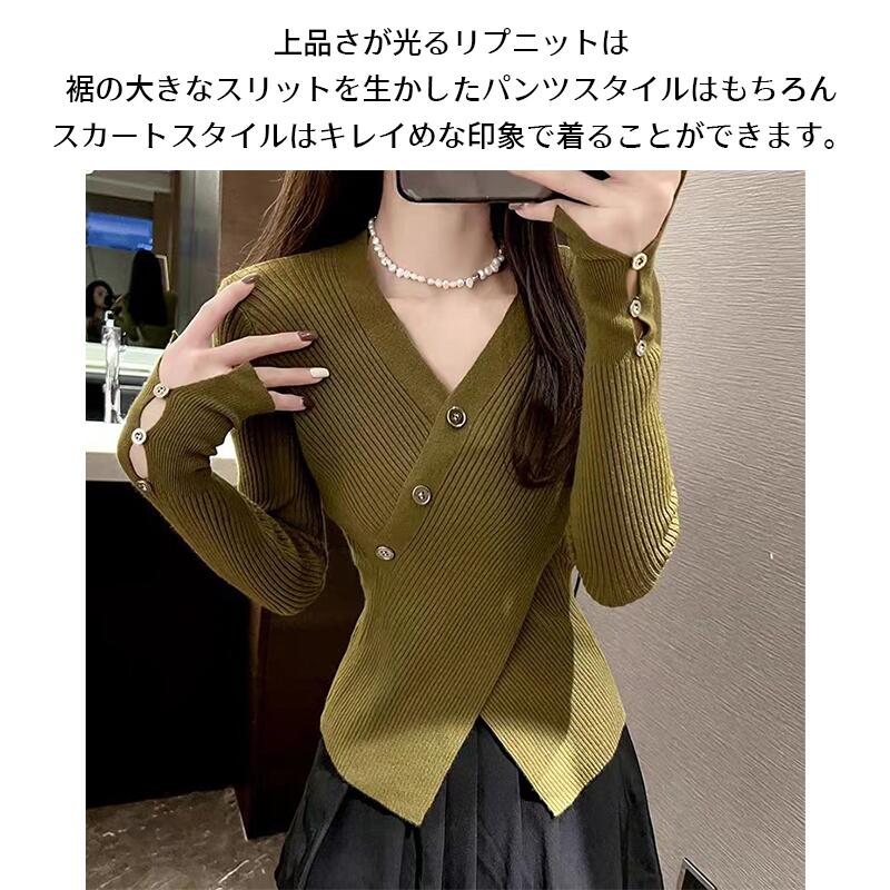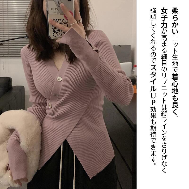 ニット セーター レディース 長袖 vネック トップス vネックセーター デザイン 着回し カシュクール やわらか リブニット リブ ロング フィット セクシー きれいめ 女子 大人 通勤 通学 上品