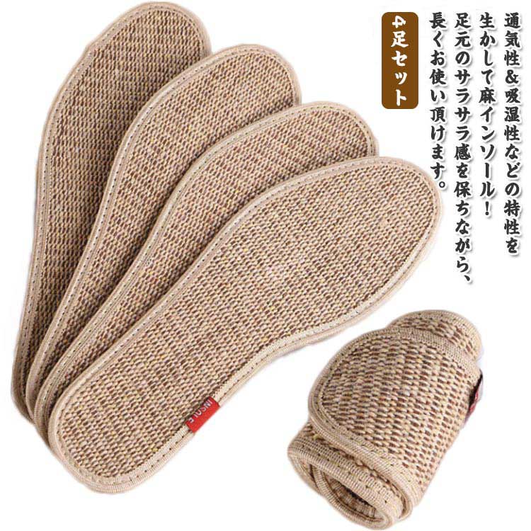 送料無料 インソール 麻 通気性 4足セット リネン 中敷き リネンインソール 消臭 女性用 男性用 両面麻