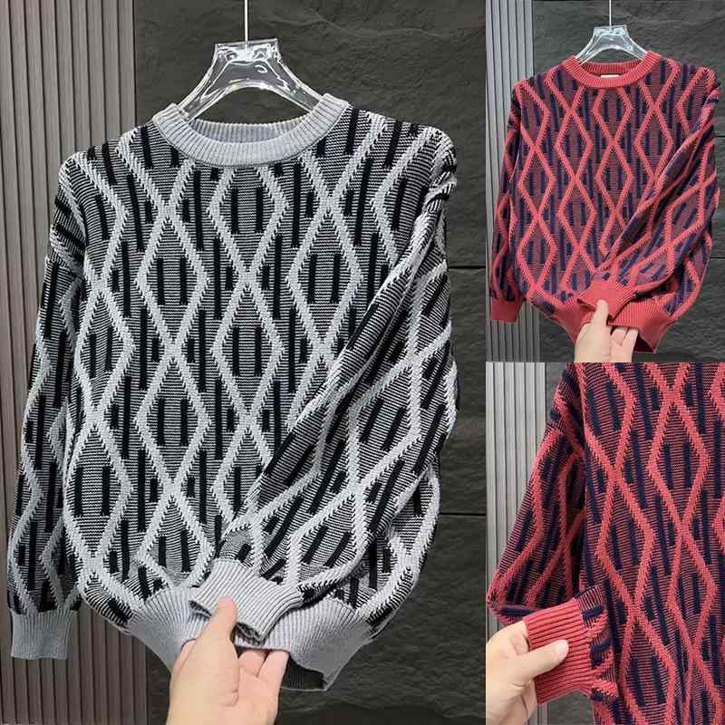 ニット メンズ 男性用 ひし形 ダイヤモンド柄 配色切り替え カラーブロック クルーネック 丸首 長袖 セーター 秋冬 トレンド スタイリッシュ ラビット混 スリム カジュアル 普段使 ウォッシャブル