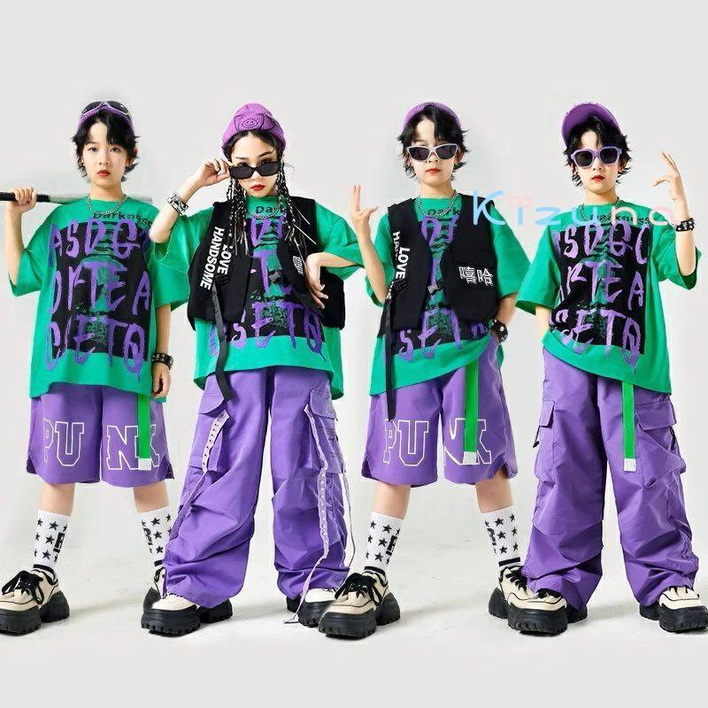 ヒップホップ ダンス衣装 セットアップ Tシャツ フィッシングベスト パンツ キッズダンス衣装 子供ダンス服 ダンスウェア K-POP グリーン パープル 韓国