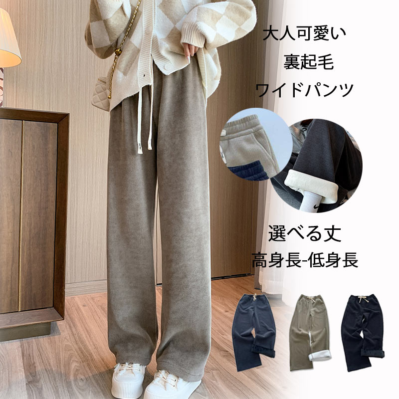 コーデュロイ パンツ 裏起毛 レディース ワイドパンツ ポケット付き きれいめ ストレートパンツ ロング ウェストゴム 短め丈 普通丈 長め丈 ロングパンツ ウェスト紐 無地 秋冬 暖 イージーパンツ