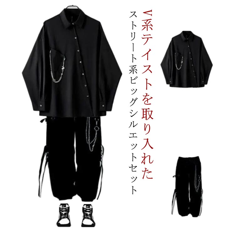 ダンス 上下セット レディース 長ズボン シャツ セットアップ メンズ ダンス衣装 ロングパンツ おしゃれ 長袖 パンツ 男女兼用 カッコイイ ブラック ビッグシルエット チェーン付き 韓国ファッ 黒