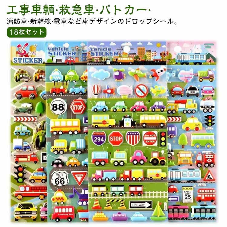 ドロップシール セット かわいい 3シール 立体シール 車シール 幼児用 子ども 男の子 ごほうびシール クルマ 工事車輌 救急車 パトカー 消防車 新幹線 電車