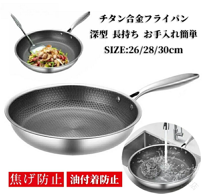 チタン合金フライパン ステンレス鋼製 弱火対応ノンスティック7層構造 深型重厚設計無煙調理対応 長持ち焦げ付きにくいお手入れ簡単家庭用日常料理鍋 シルバー 26cm 28cm 30cm 24cm
