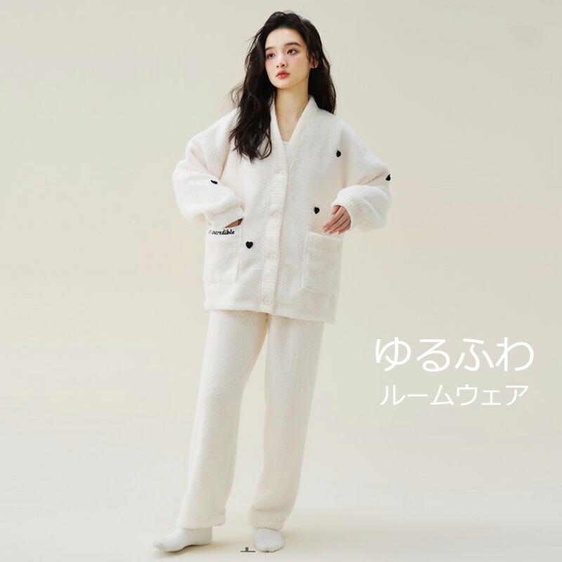 長袖パジャマ Vネック 前開き シンプル 上下セット 暖かい ルームウェア 部屋着 寝間着 着心地やわらか かわいい パジャマ 寝巻 ふんわり ゆるふわ 春 冬 秋 女性 入院着 授乳 授 レディース