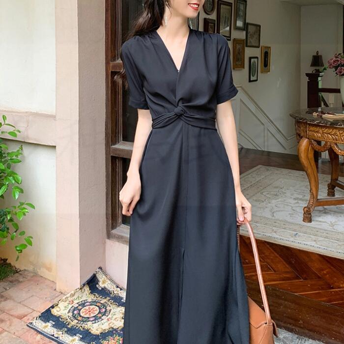 発表 セレモニー 半袖 ドレス ワンピ レディース きれいめ ミモレ丈 エレガント 袖あり ロングワンピ ワンピース ウエストリボン