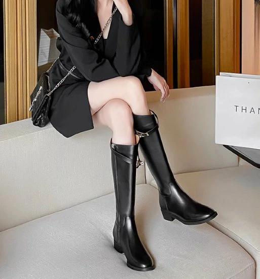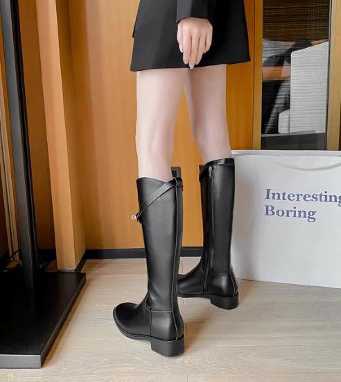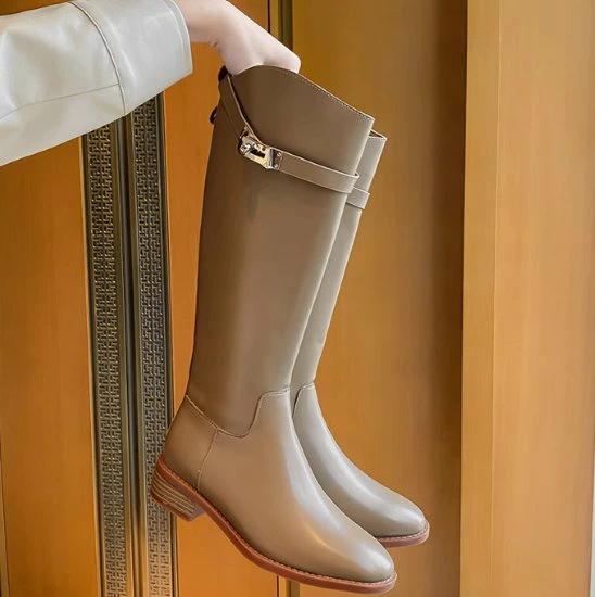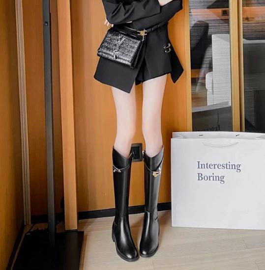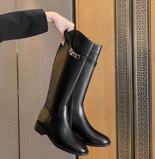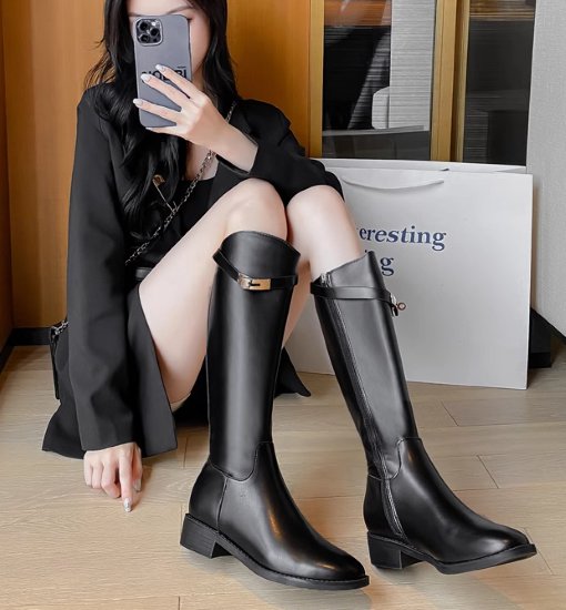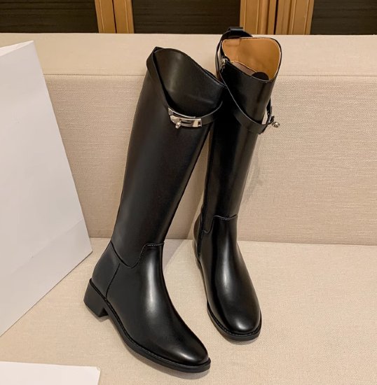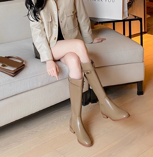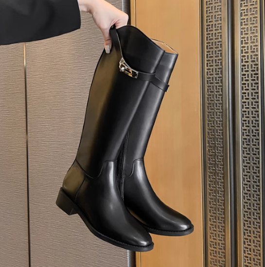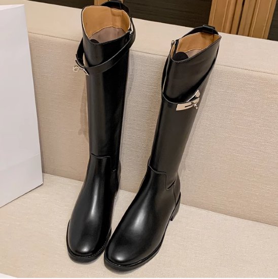 シンプル ジョッキーブーツ ベルトデザイン 無地 メタルロック シューズ ローヒール 靴 レディース スタイリッ きれいめ ブーツ
