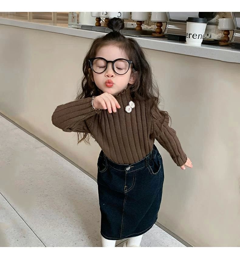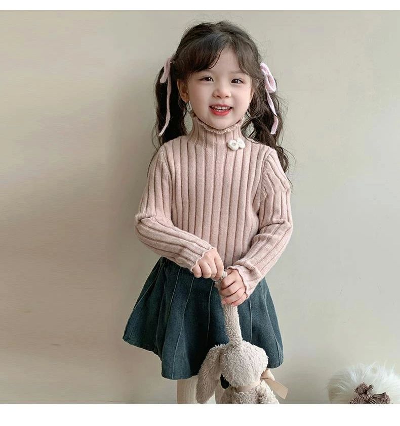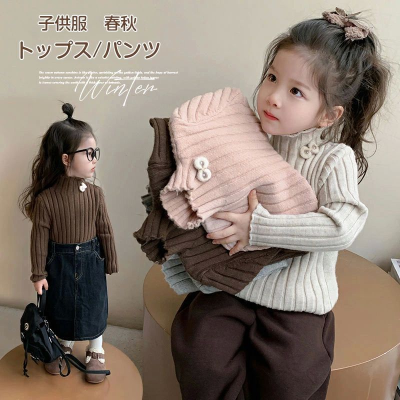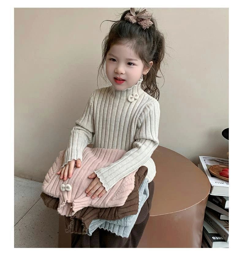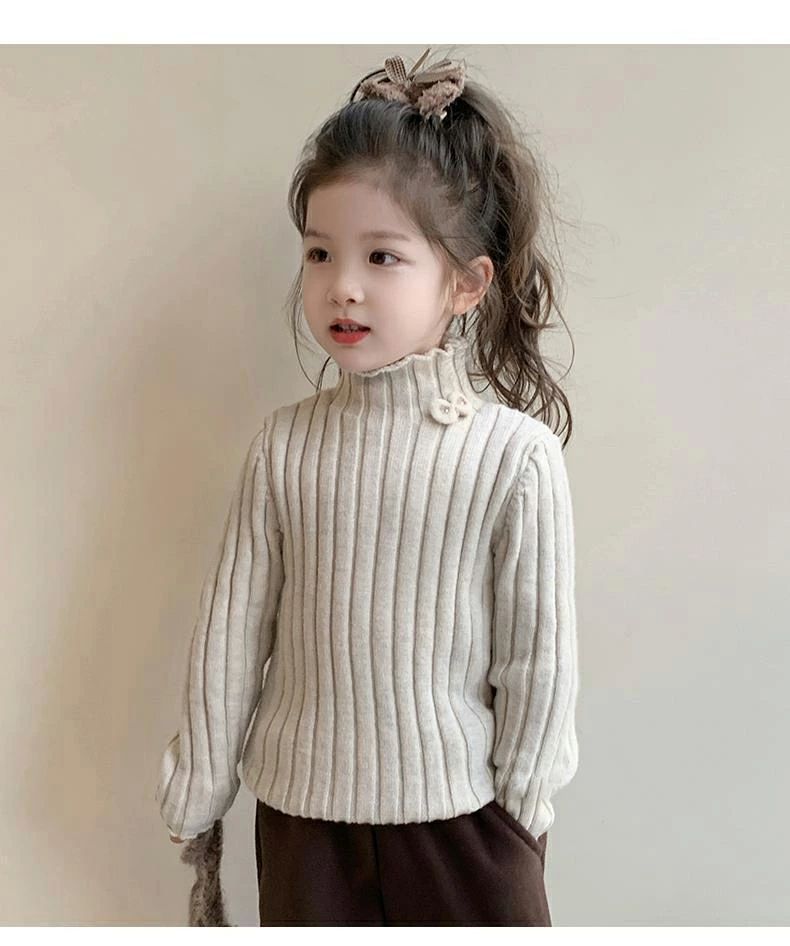コーヒ オフホワイト ピンク 無地 リボン カジュアル 弾性 ソフトコットン 暖かい ベビー服 高襟 ハイネック セーター 長袖