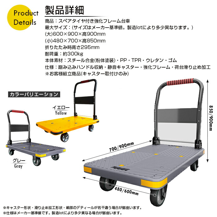 プロ仕様 積載荷重300kg スペアタ グレー イエロー (大) 60×90cm荷台サイズ (小) 48×70cm荷台サイズ