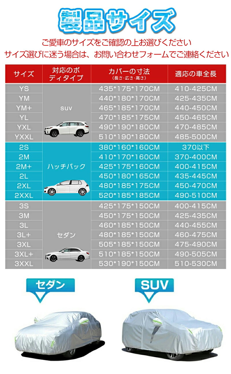 自動車カバー 車 ボディカバー カーカ YS YM YM+ YL YXL YXXL 2S 2M 2M+ 2L 2XL 2XXL 3S 3M 3L 3L+ 3XL 3XL+ 3XXL