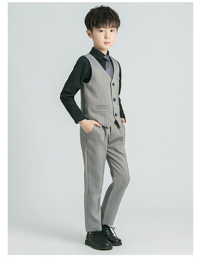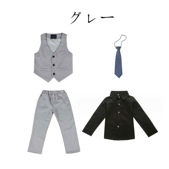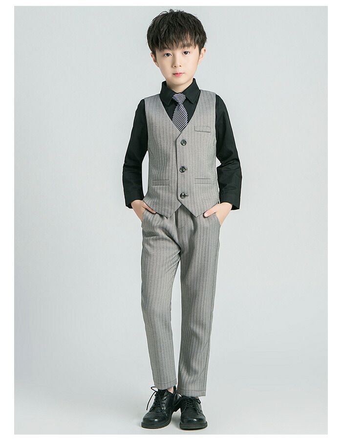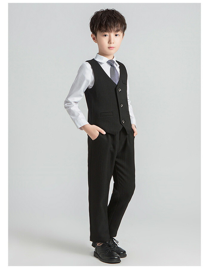 男の子 フォーマル スーツ 発表会 卒園式 入学式 卒業式 受験用 七五三 シャツ+ベスト+ズボン+ネクタイ 4点セット キッズ スーツ 上下セット 普段着 通学着 ジュニア服 通園着 団体服 演出服 小学校 クラス活動 詩の朗読、大合唱、集団公演 ブラック グレー 90-170