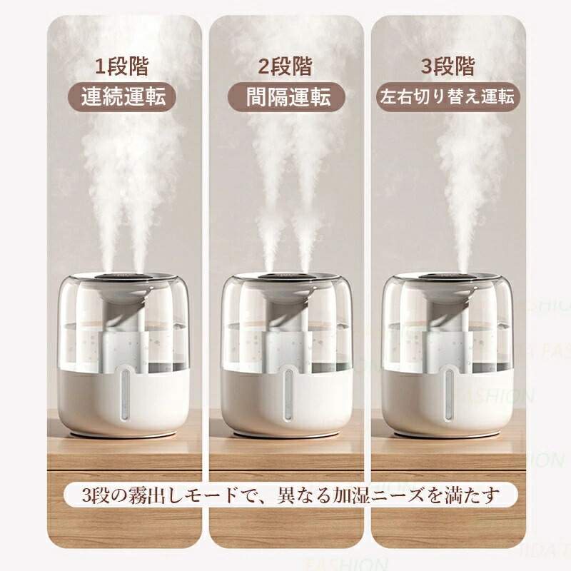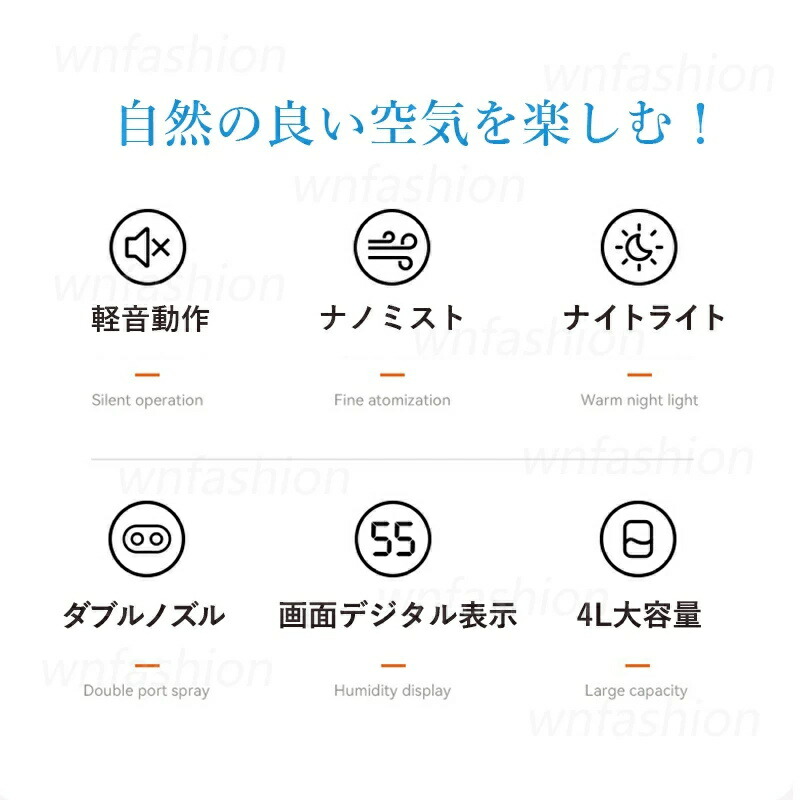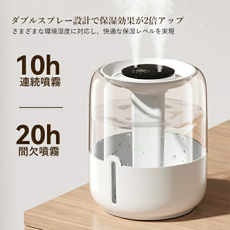 デュアルミストデザイン: 2つの噴霧口があることで、加湿性能が2倍に向上し、環境の湿度に合わせて調節することができます。