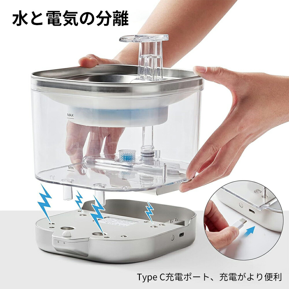 水飲み器はバッテリーとType-C充電2way 電対応できる。内蔵5000mAhバッテリー付き、35日間連続使用可能。庭、リビング、キャットタワー、キャットケージに自由に置けて使用場所の制限なくて、停電時も心配ありません。