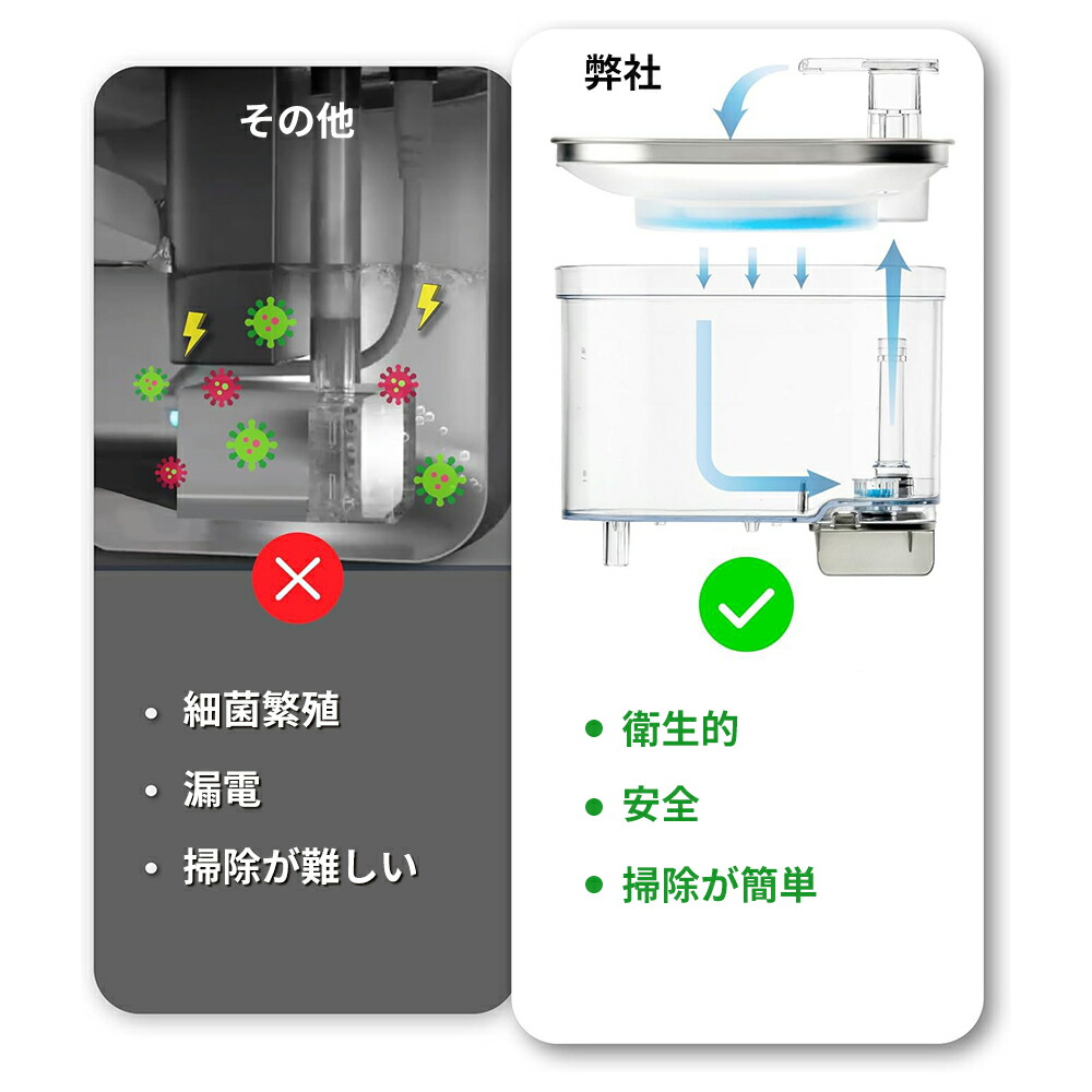 ペット給水器は、SUS304食品用ステンレスを使用しており、摩耗しにくく、長持ちするのが特徴です。 プラスチック製の給水器は、かじり傷がついて隙間ができ、細菌が繁殖してペットの飲み水の健康に影響を与えることがあります。
