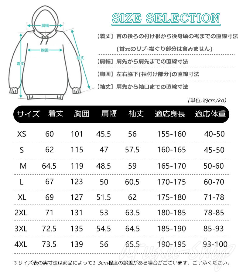 4XL:着丈73.5 / 胸囲139 / 肩幅56 / 袖丈65.5cm