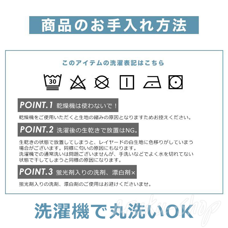 ・ドライクリーニング、乾燥機、アイロンのご使用はお避け下さい。