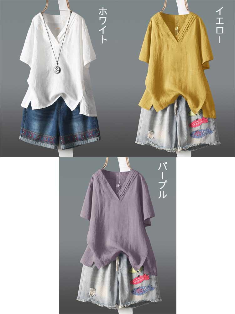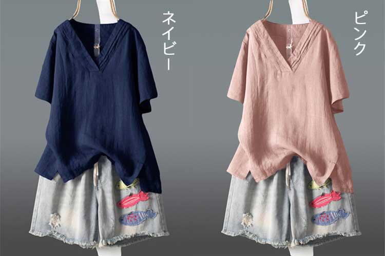 Tシャツ レディース リネン 半袖 ト レディースファッション 続々登場 ホワイト ネイビー ピンク パープル イエロー M L XL 2XL 3XL 4XL