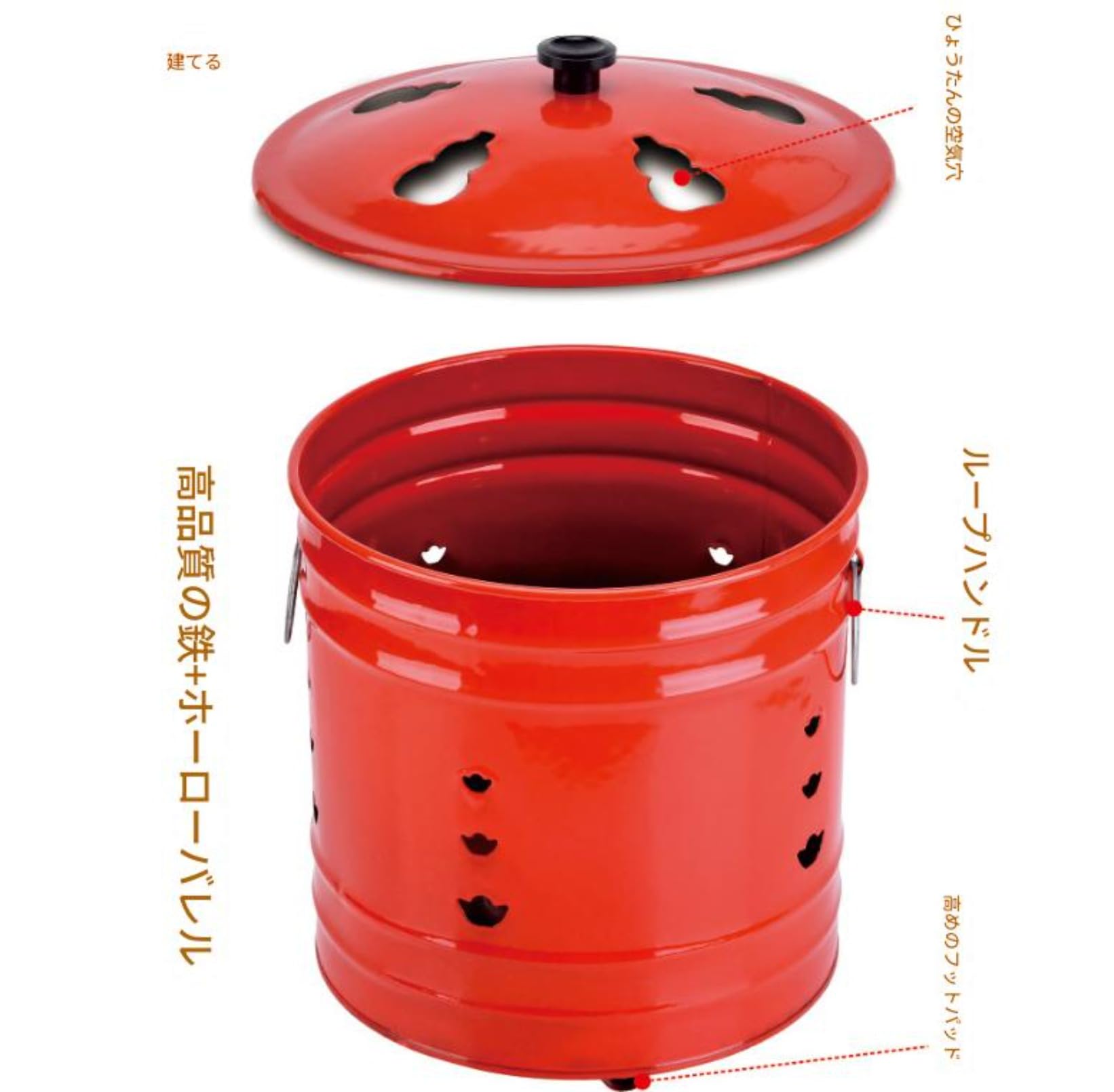 家庭用焼却炉、ドラム缶焼却炉、蓋とハンドル付き 燃焼バケツ 紙、落ち葉、木のゴミを燃やすのに使用されるパターン付き