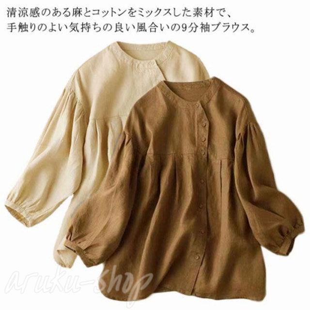 リネン ブラウス レディース ボリューム袖 シャツ トップス 長袖 Tシャツ ナチュラル 綿麻 ゆったり 体型カバー 半袖 無地 薄手 おしゃれ 大きいサイズ 春 夏 カジュアル