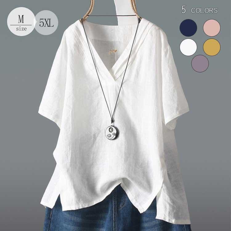 Tシャツ レディース リネン 半袖 トップス ふんわり 着心地いい Vネック ブラウス オシャレ 綿麻混 オフィス お呼ばれかわいい 通勤 通学 あわせ易い 日常