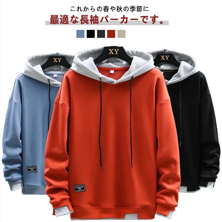 プルオーバー パーカー メンズ 長袖 フード付き トレーナー スウェット 重ね着風 無地 トップス シンプル カジュアル 大きめ 春秋冬 柔らかい ルームウェア スポーツウェア おし 部屋着