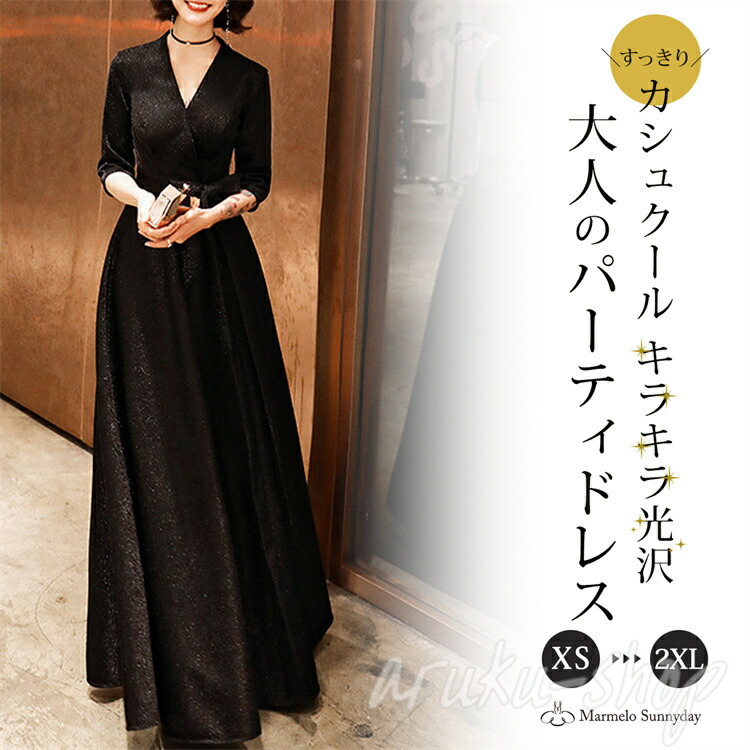 パーティードレス かっこいい ロング 黒 半袖 キラキラ 大きいサイズ カシュクール 結婚式 演奏会 ロングドレス フォーマル マキシ丈 Aライン フレア 袖あり シンプル リボン 可愛い 春 無地