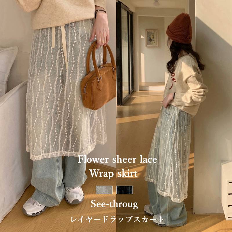 シアーレースフラワー刺繍レイヤードラップスカート 人気再販 レディース SNS話題スカート シースルーボトムス 春夏巻きスカート 巻き レイヤード 重ね着 ラップスカート ベージュ ブラ 巻くスカート