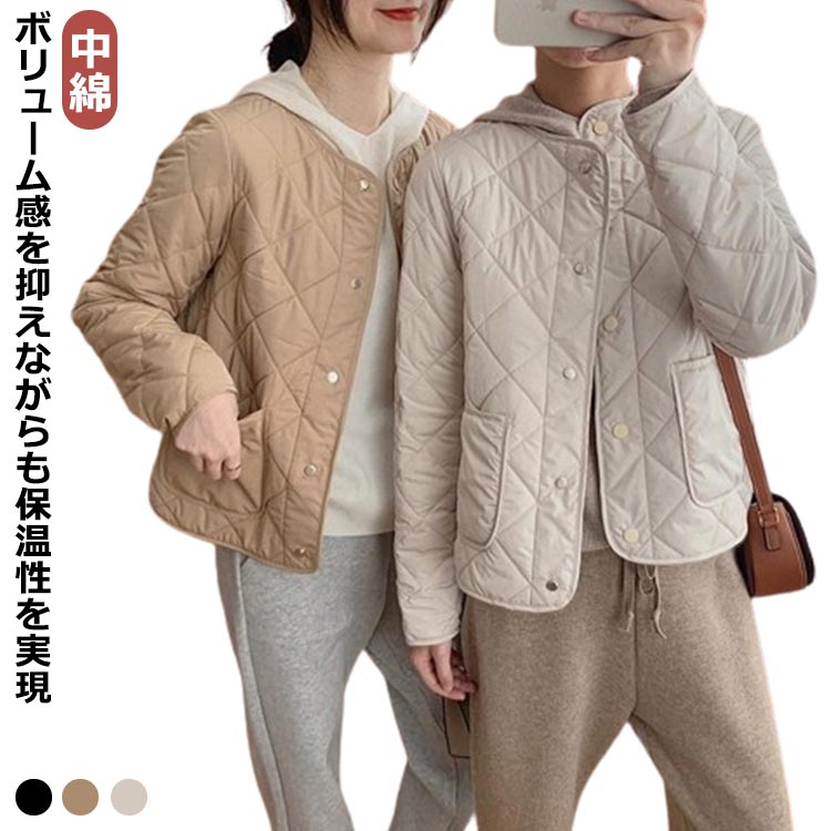 ジャケット 中綿 キルトジャケット 春 レディース カジュアル 大人 冬 ベージュ キルティング ノーカラージャケット ブルゾン ショート丈 中綿ジャケット 韓国 フ アウター