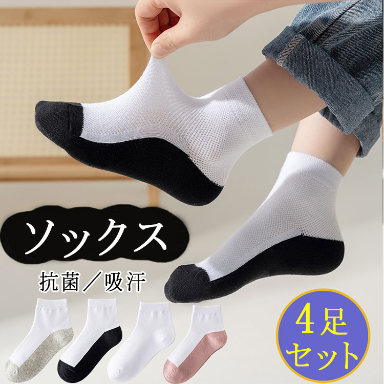 最大20% 靴下 子供 スクールソックス 4足セット ショート丈 メッシュ キッズ 男の子 女の子 ジュニア 通学 部活 洗い替え 足底 グレー ピンク 汚れ目立ちにくい 黒