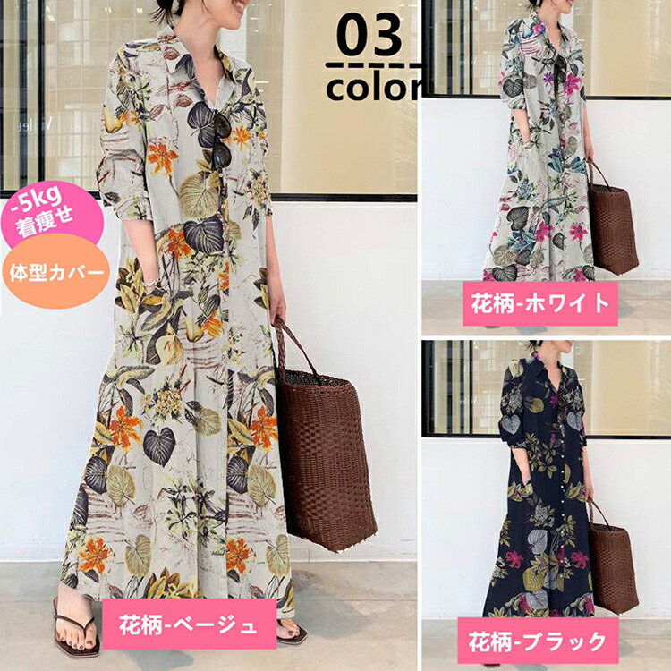 綿麻ワンピース レディース 春 夏 秋 ロングシャツワンピース 長袖 花柄 マキシ丈 Aライン カジュアル シンプル 体型カバー コットンリネン リゾートワンピース おしゃれ 人気 ワイ 大きいサイズ