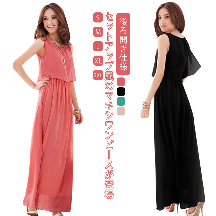 夏ワンピース 夏 ドレス ノースリーブワンピース 可愛い ふんわり マキシワンピース ロング丈 フォーマル リゾート セットアップ風 足長 袖なし 大きいサイズ レディース シフォン 上品