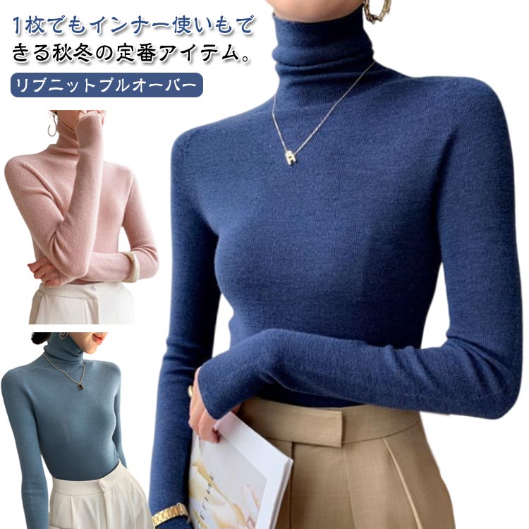 リブニットトップス タートルネック 薄手 タイト スリム 細身 ストレッチ 長袖ニット インナー タートルニット