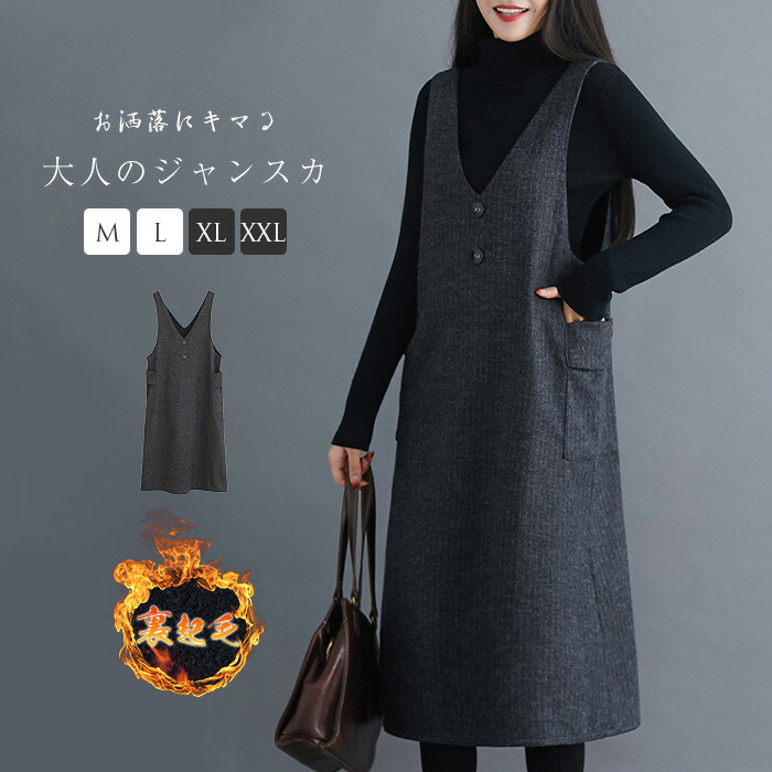 ジャンパースカート レディース ツイード ワンピース 裏起毛 厚手 春 秋 冬 Vネック ロング丈 ジャンスカ ベスト レイヤード 体型カバー 可愛い 重ね着